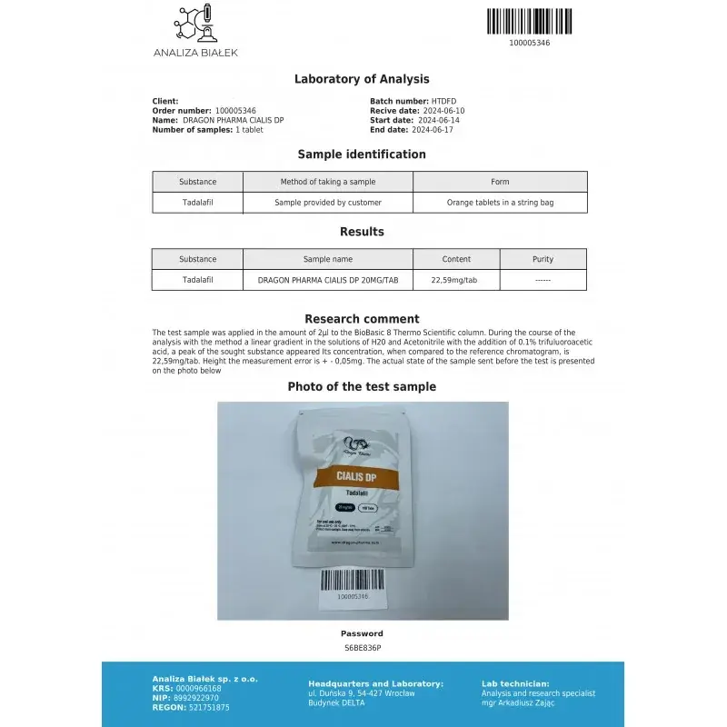 Dragon Pharma's commitment to quality is evident in their Cialis formulation. Recent independent laboratory testing revealed an actual potency of 22.31mg per tablet versus the claimed 20mg—an 11.5% overage that demonstrates their commitment to ensuring consumers receive at least the advertised potency. This precision manufacturing ensures consistent, reliable effects with every tablet. In a market where underdosed sexual performance products are common, Dragon Pharma's verified potency provides confidence and predictable results. The 100-tablet package offers exceptional value for both occasional users and those incorporating tadalafil into their regular supplementation protocol.
